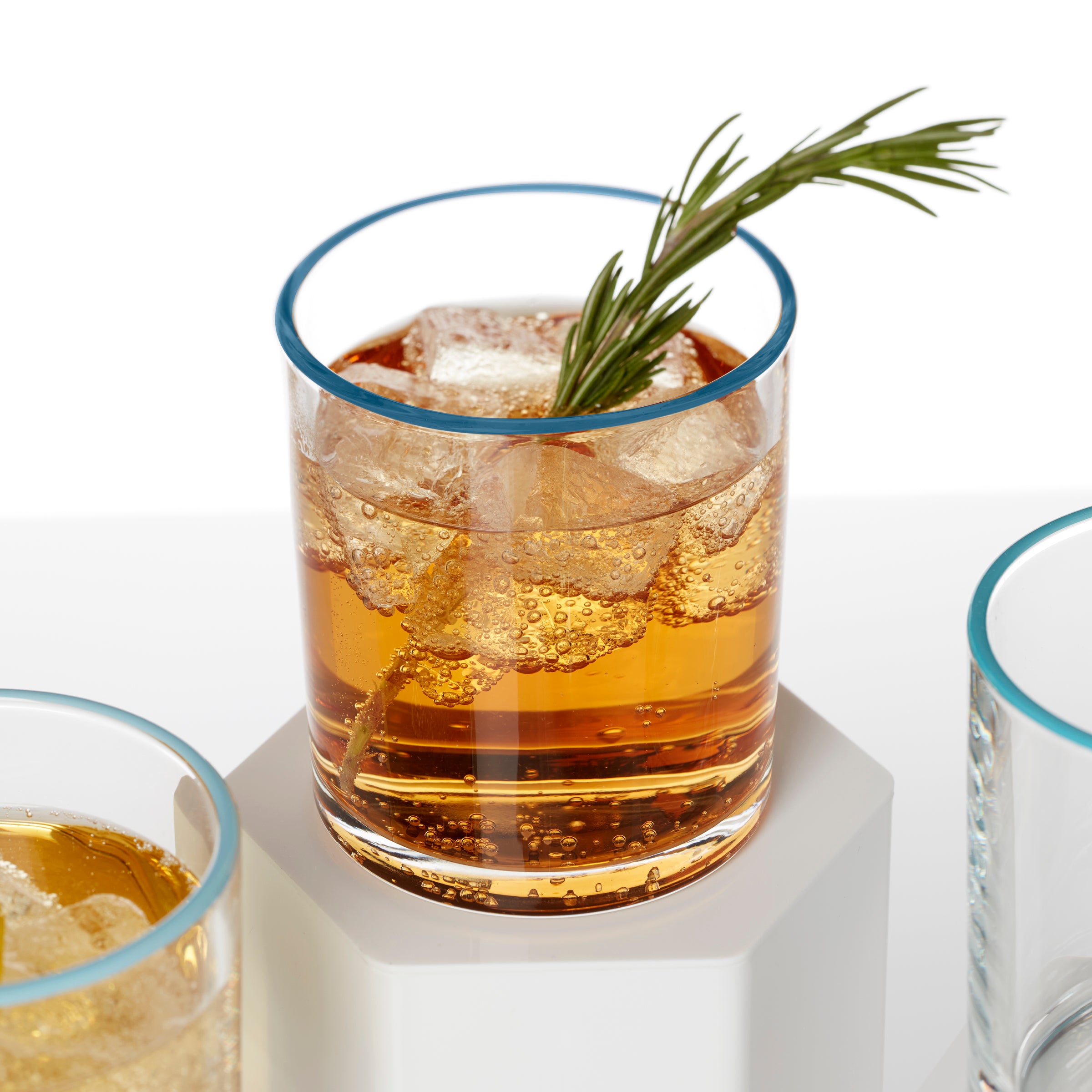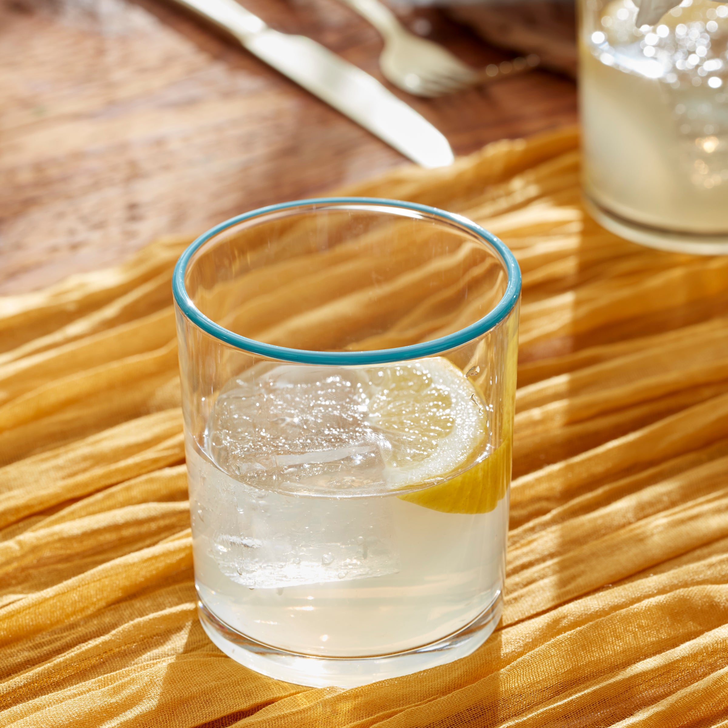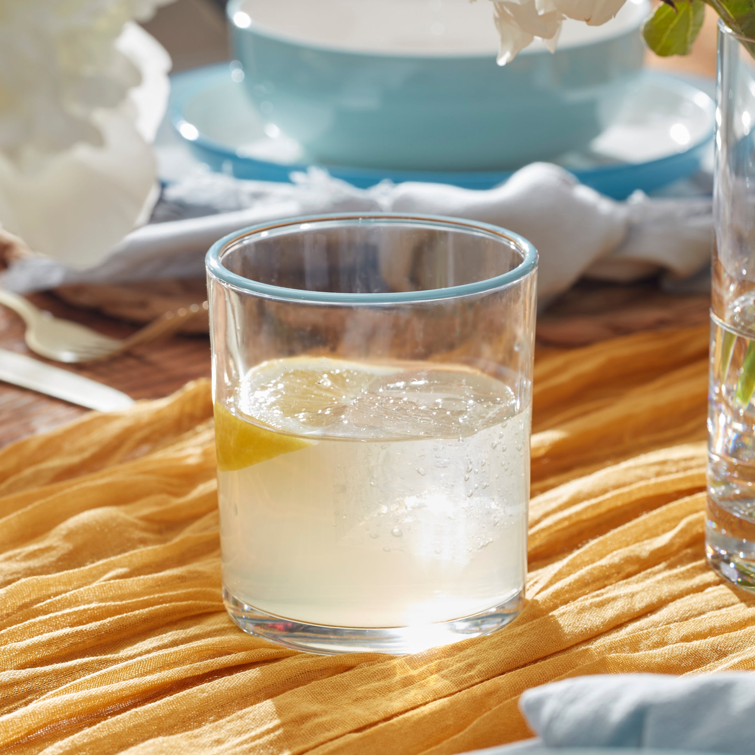 Just right from morning to night, these medium tumblers are ready to refresh. The touch of color on rims make them a stylish staple for any space. Set of six. Measures 4″H x 3.25″ diameter with a 13.5-oz capacity. Glass is dishwasher safe.