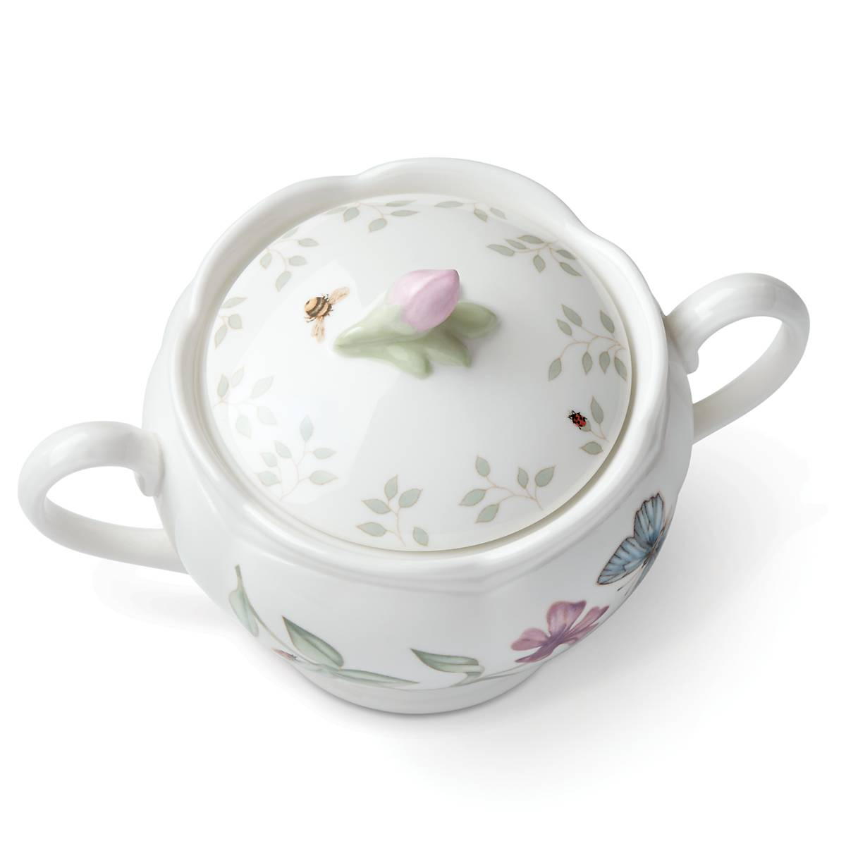 A sculpted pink flower forms a charming finial on the lid of the Butterfly Meadow Sugar Bowl. Two handles on either side boast an elegant contour, while the Butterfly Meadow’s classic garden illustrations take the stage across the durable white ceramic porcelain surface. This sugar bowl is dishwasher and microwave-safe.