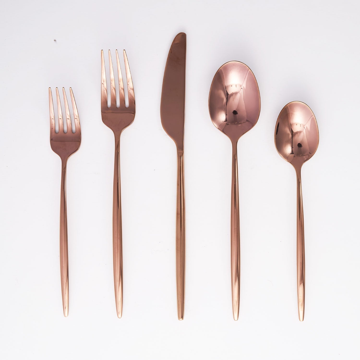 20-piece forged service for 4 with a slender handle that evokes a classic Scandinavian feel in a warm, copper color mirror finish.