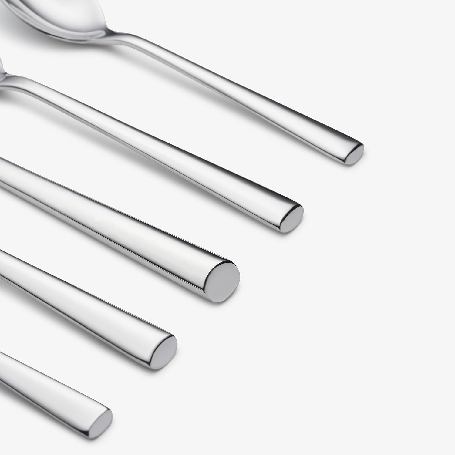 20-piece forged service for 4 with a long, flared handle and angled detail at the tip of each handle. This pattern features a polished mirror finish.