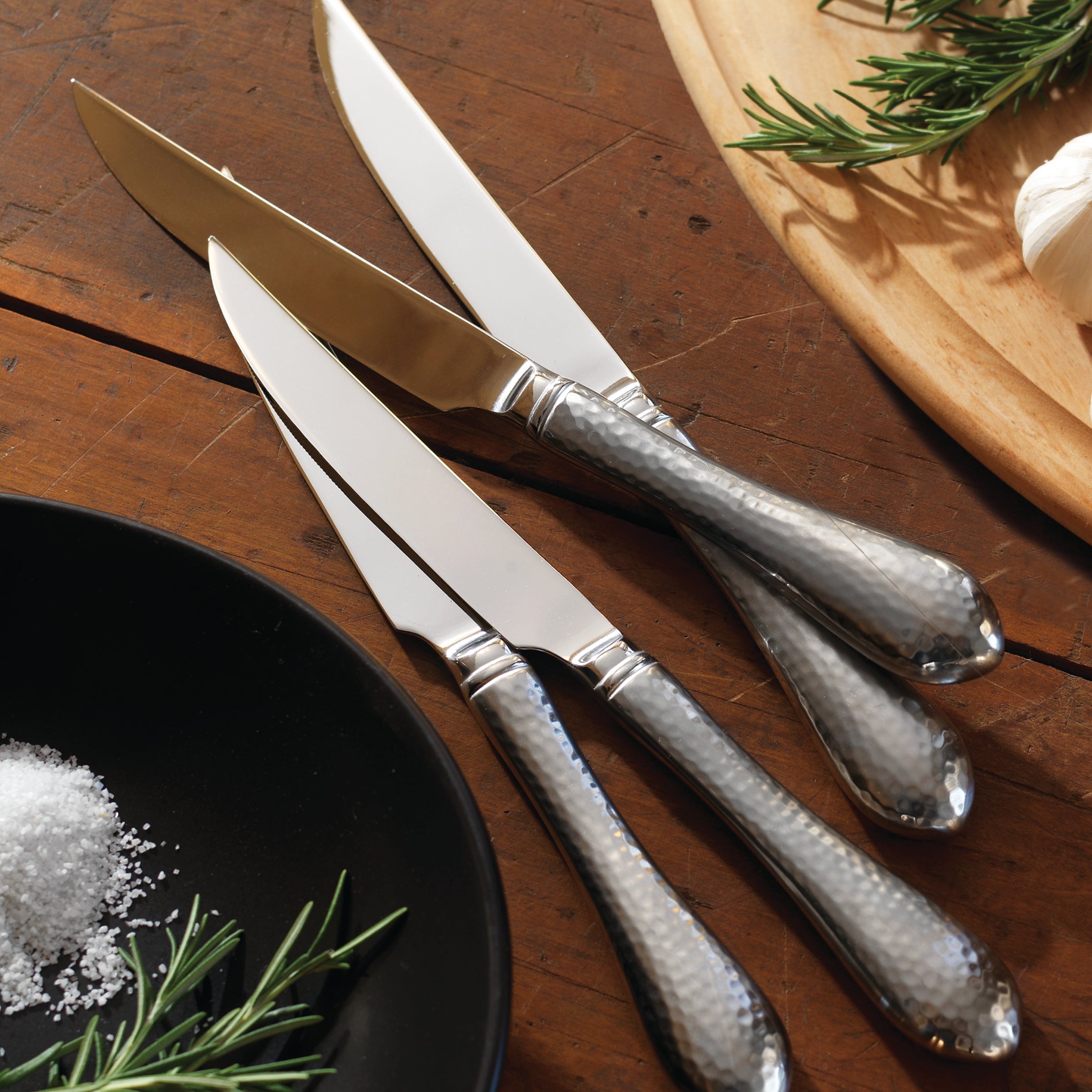These four steak knives showcase a classic teardrop shape reminiscent of 18th-century design, with a hammered texture. Part of the Hammered Antique Collection, these old-world design elements prove timeless fashion and fit with any table setting.