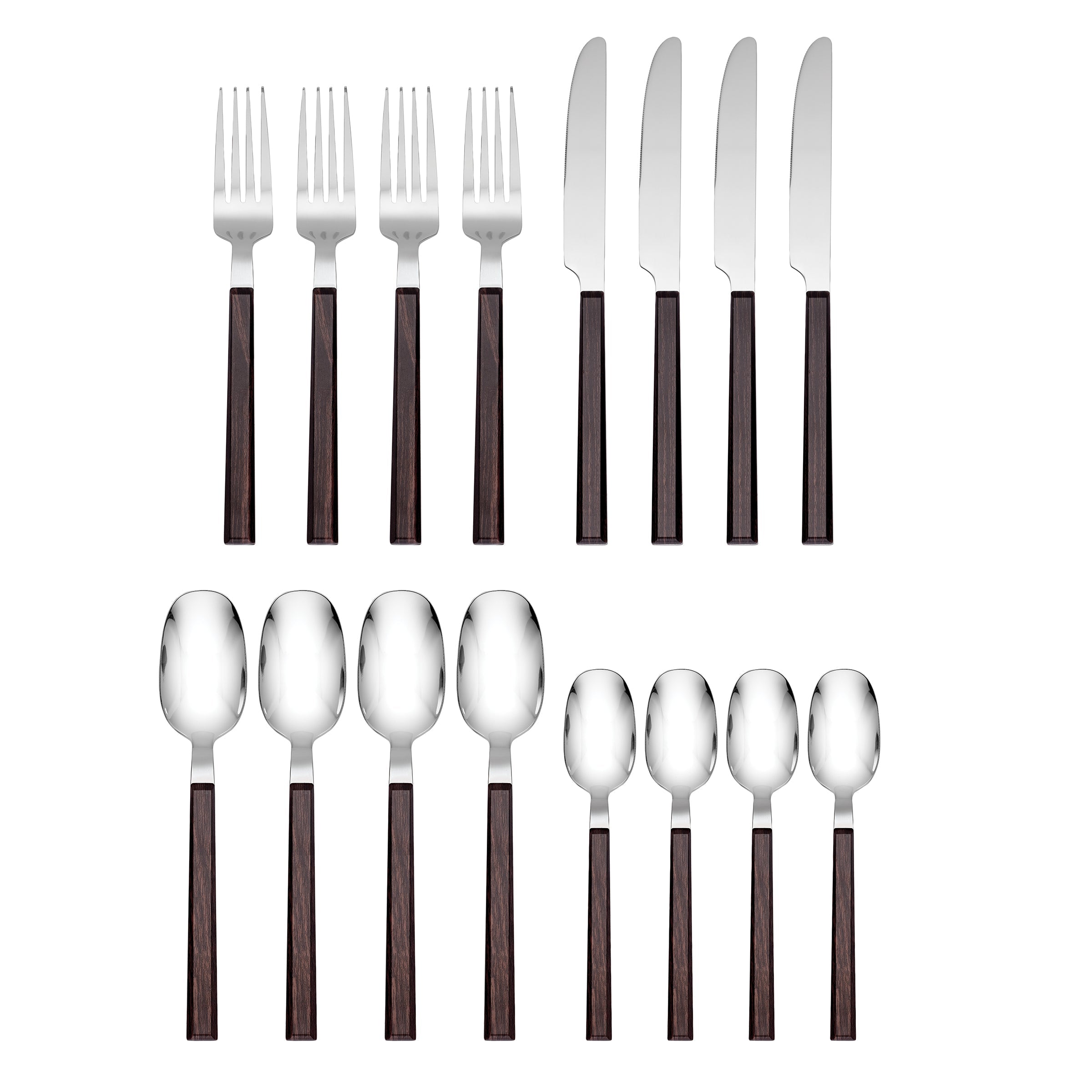 The Henley Brown set by Hampton Forge features naturally dark colored wooden handles and original design. four teaspoons, four tablespoons, four dinner forks, and four dinner knives.