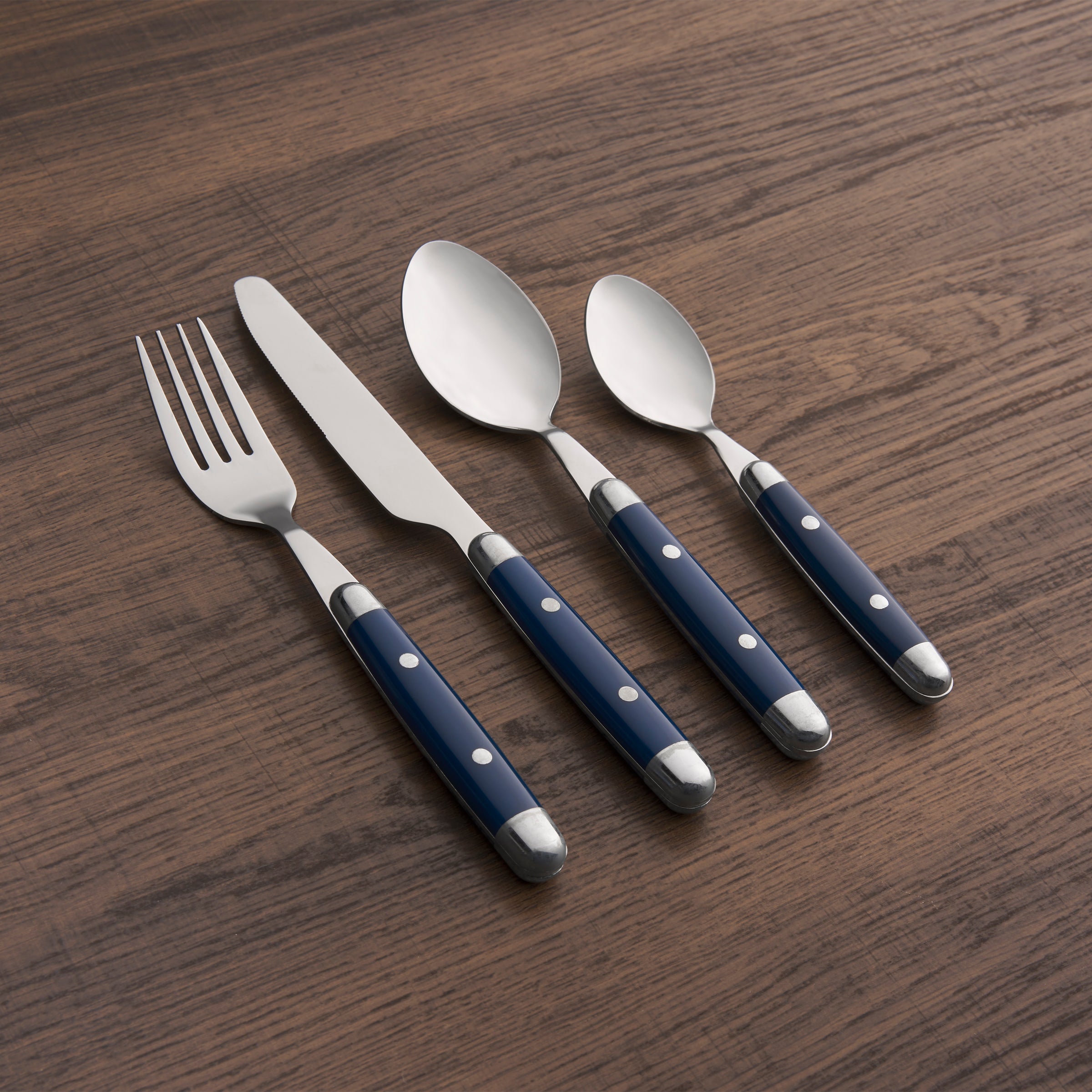 16-piece service for 4 forged using high-quality stainless steel. Features a pleasant retro look, comfortable blue oval handles with stout rivets, and smoothly integrated metal tips.