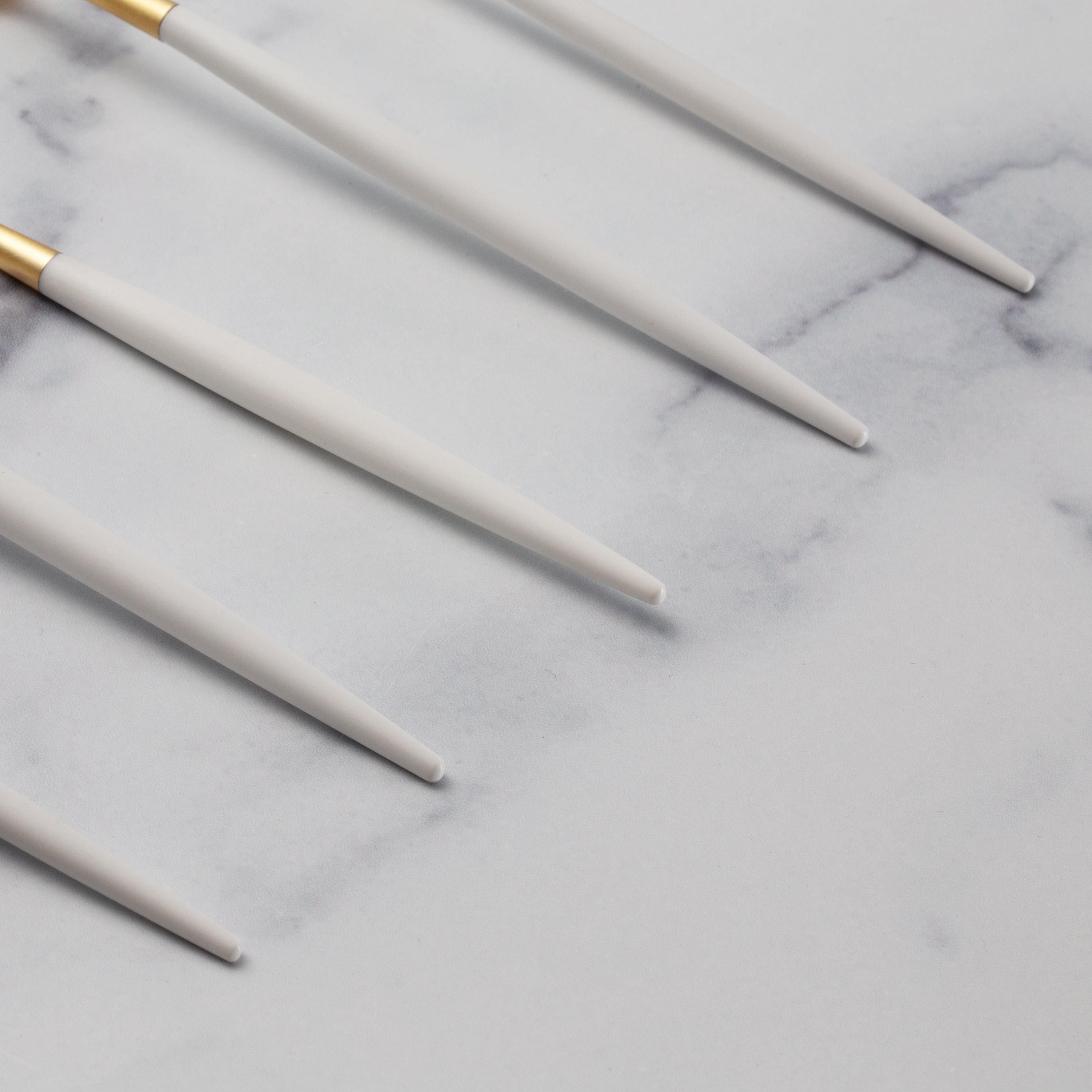20-piece service for 4 forged using highest quality 18/10 stainless steel and premium POM plastic. The contrasting sleek white handles and elegant brushed gold-tone heads make a chic statement on any tablescape.