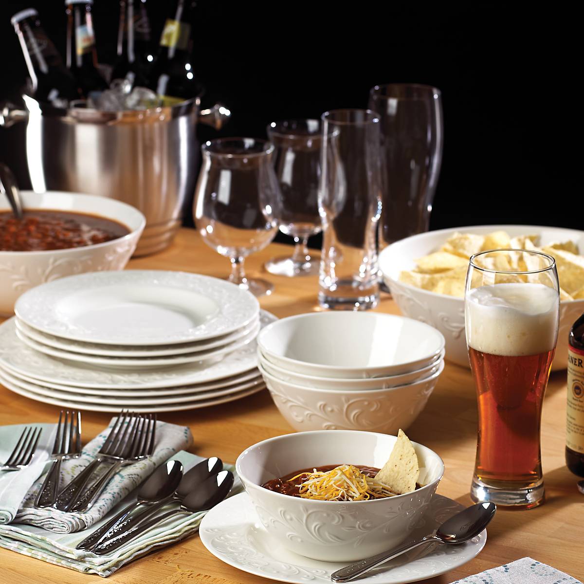 The simply elegant Opal Innocence Carved 4-piece Set features a flowing scroll motif in a raised relief on each pristine white rim. This casual and durable ceramic porcelain set is microwave and dishwasher-safe, for added convenience.